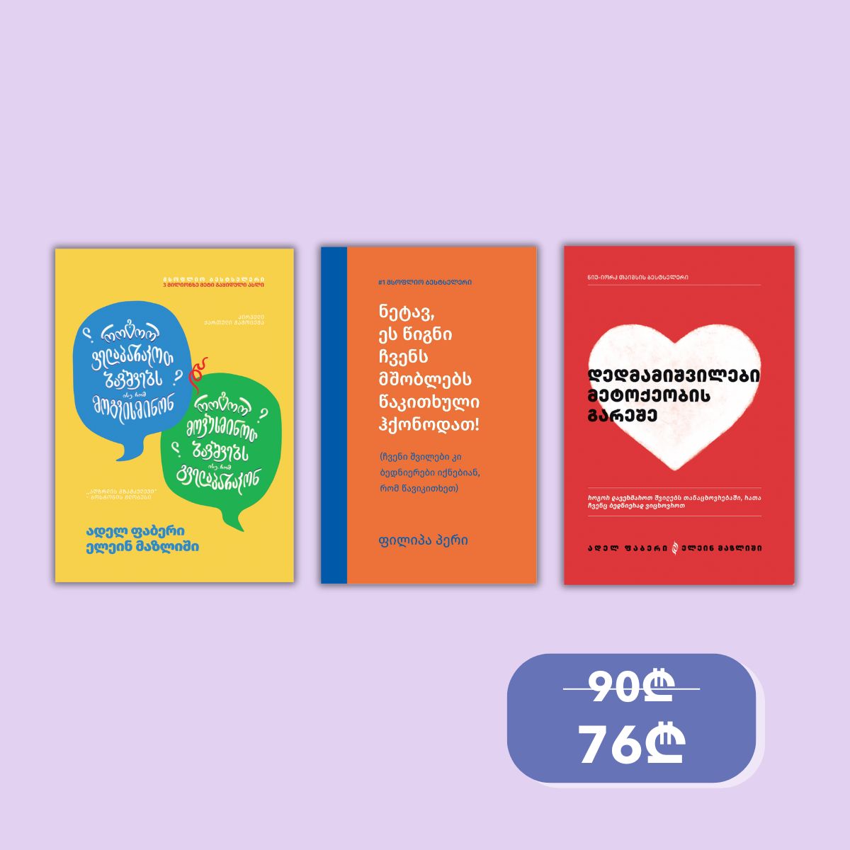 სამი მსოფლიო ბესტსელერი წიგნი იმის შესახებ თუ როგორ უნდა ვიყოთ უფრო ეფექტურები ჩვენს შვილებთან.მარტივი, თუმცა საოცრად ეფექტიანი გზები დაგეხმარებათ კომუნიკაციის გაუმჯობესებასა და ჯანსაღი ურთიერთობების ჩამოყალიბებაში შვილებთან.